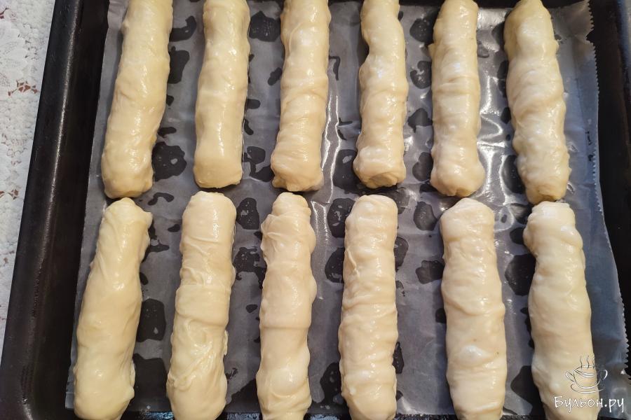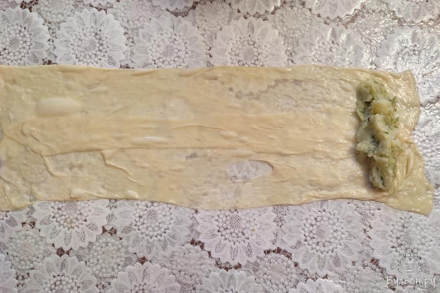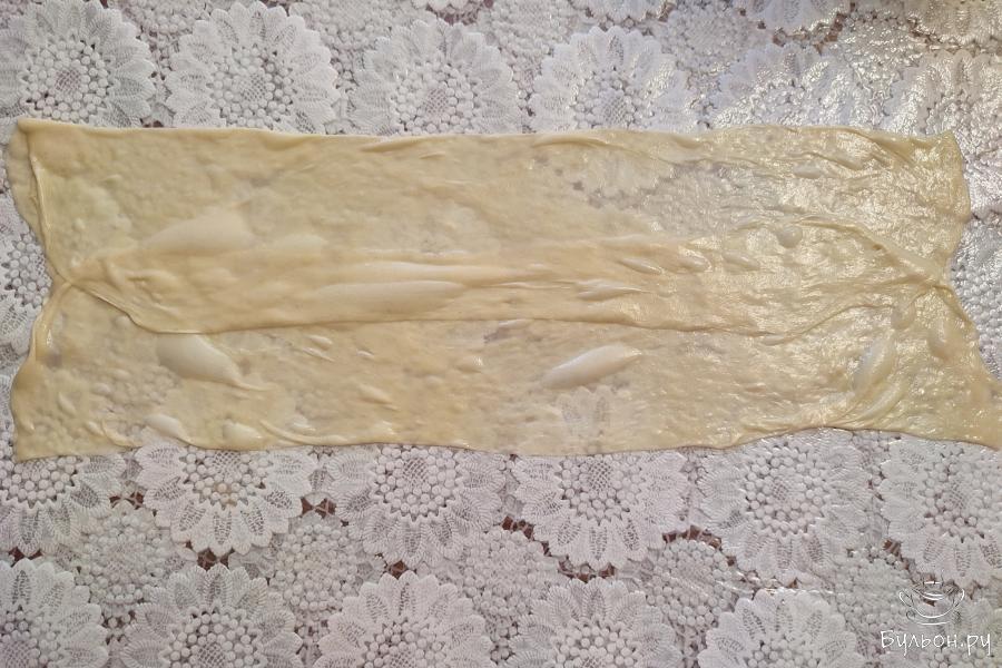 12. Растянутое тесто немного смазать маслом. По длинной стороне с двух сторон сложить тесто к середине.
