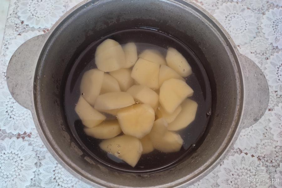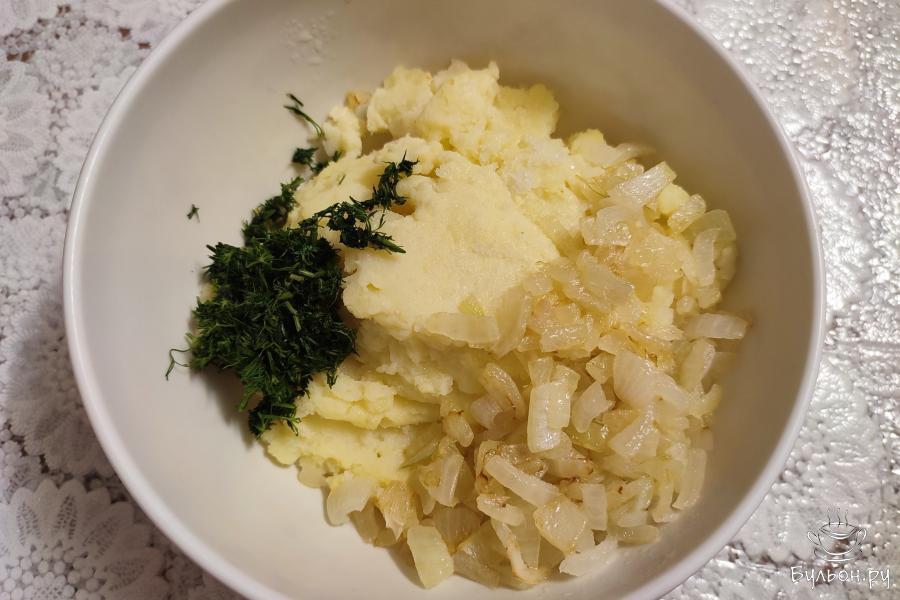 3. Воду с картофеля слить, толкушкой размять в пюре. Смешать пюре с жареным луком, нарезанным укропом и 2 щепотками соли.