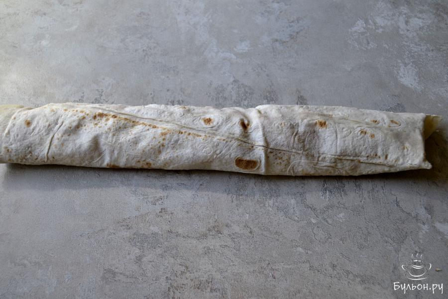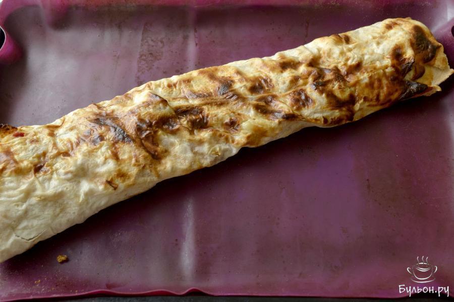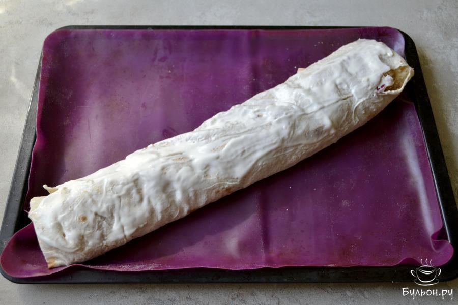 7. Переложите рулет на противень. Смажьте поверхность сметаной и поставьте в духовку, заранее разогретую до 180 градусов.