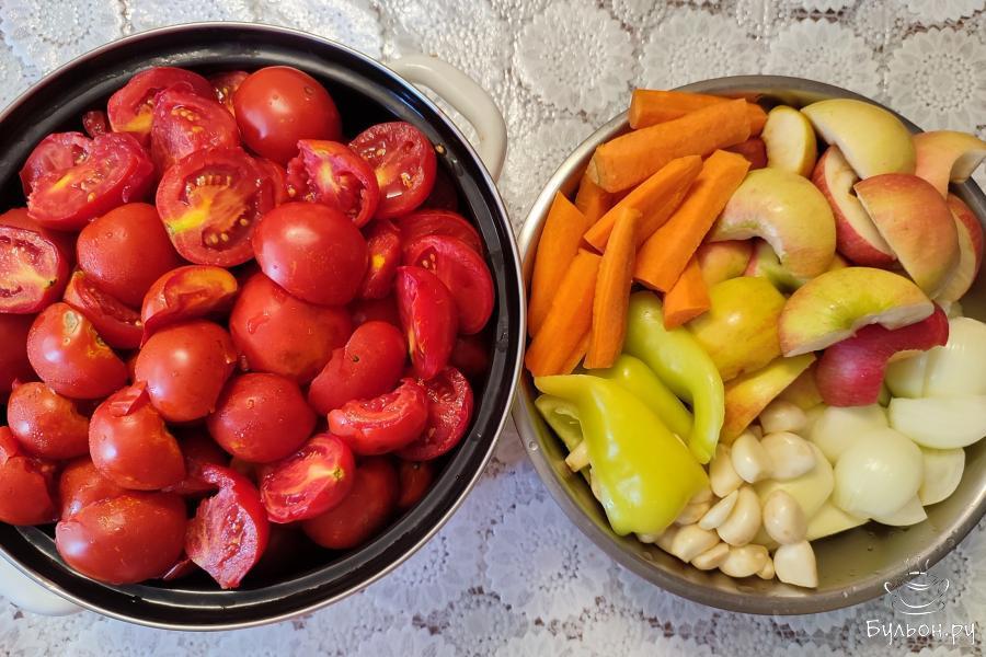 1. Все овощи (помидоры, перец сладкий, морковь, лук и яблоки) помыть, почистить и разрезать на части. Чеснок, а так же перец чили, если вы решили его добавить, помыть и почистить.