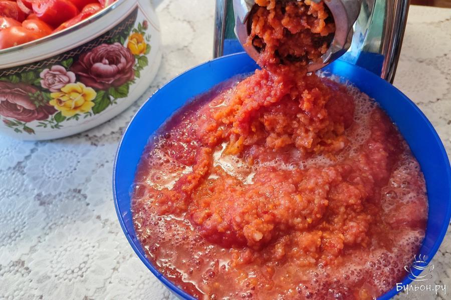 2. Все подготовленные овощи, включая яблоки, измельчить на мясорубке с мелкими отверстиями. Поместить в кастрюлю, в которой будете варить соус.