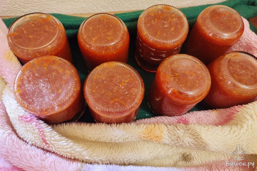 6. Перевернуть банки крышками вниз и укутать теплым одеялом до остывания. Из указанного количества ингредиентов получается 4 литра соуса.