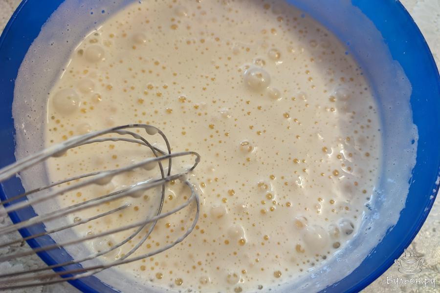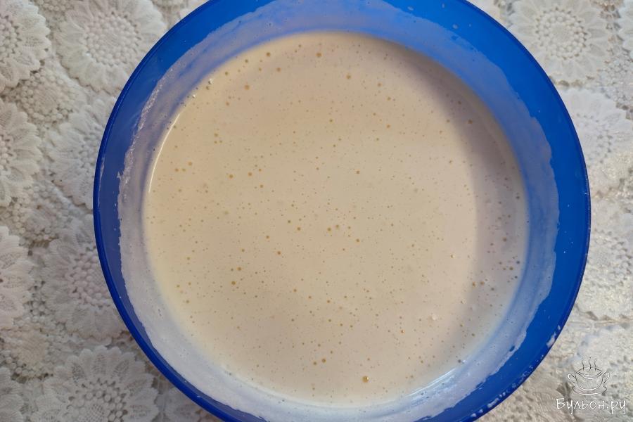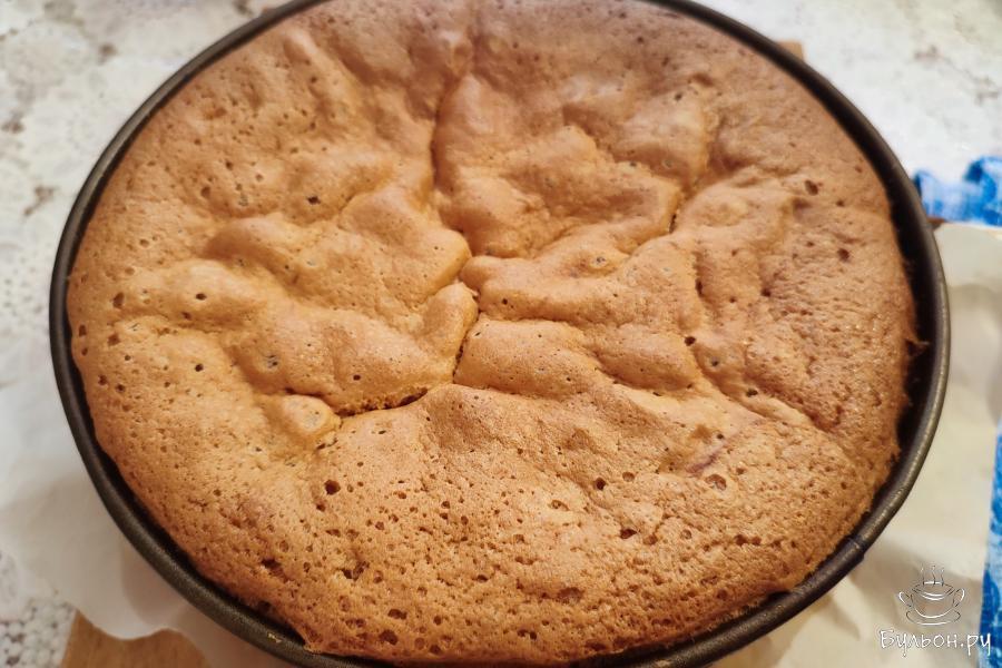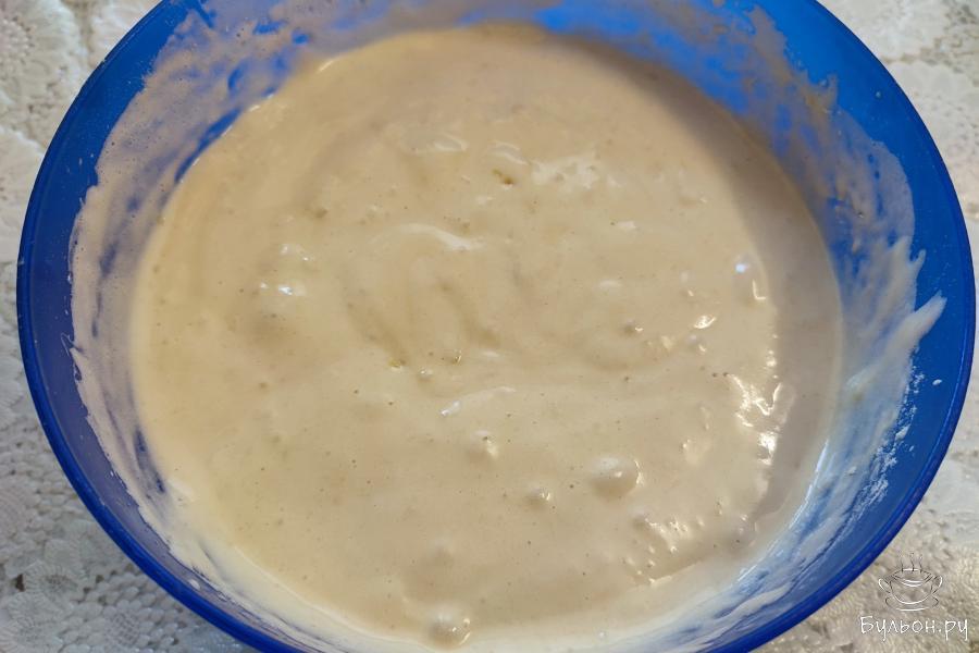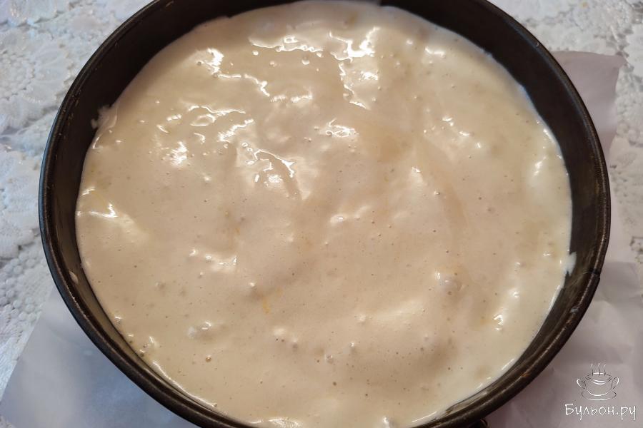 5. Тесто размешать аккуратными движениями, снизу вверх. Форму, диаметром 20 см, застелить пекарской бумагой. Вылить 2/3 части теста в форму.