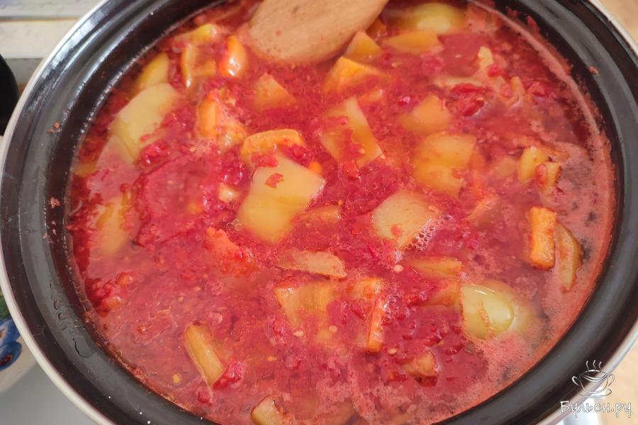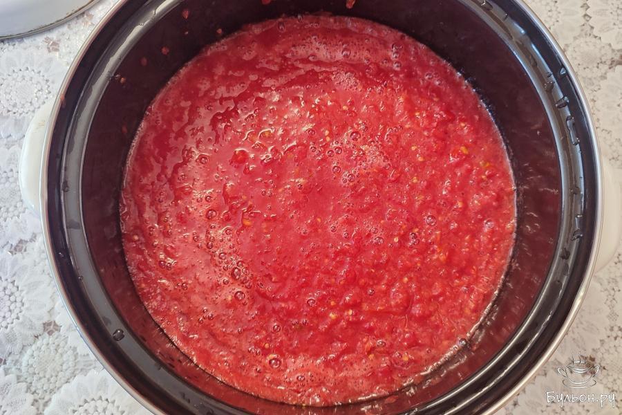 3. Соединить перемолотые помидоры и перец в глубокой кастрюле, довести массу до кипения. После закипания налить масло, добавить соль и сахар. Варить без крышки 30 минут на небольшом огне.