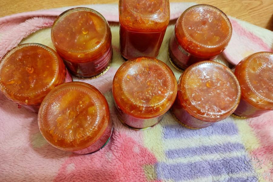 5. Готовое лечо убрать с огня, налить уксус (9%), хорошо перемешать. Разлить по стерилизованным банкам, закупорить крышками.