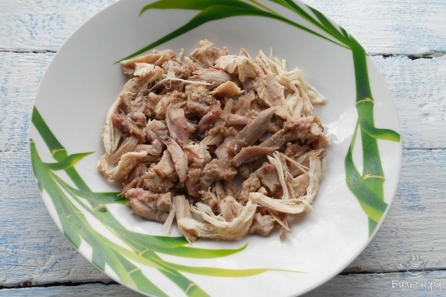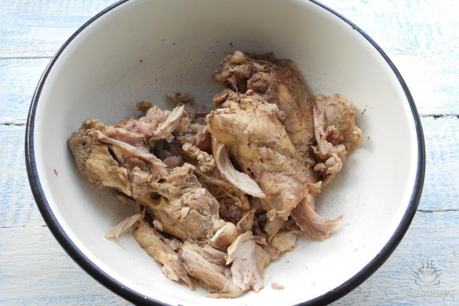 6. Отделить мясо от костей, порезать или порвать руками, разложить по тарелкам или формам на половину объема.