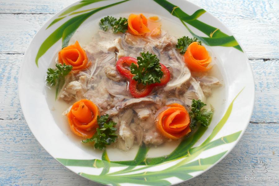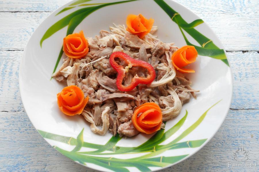 7. Украсить мясо на свое усмотрение. Я украсила розочками из вареной моркови и кружочком болгарского перца.