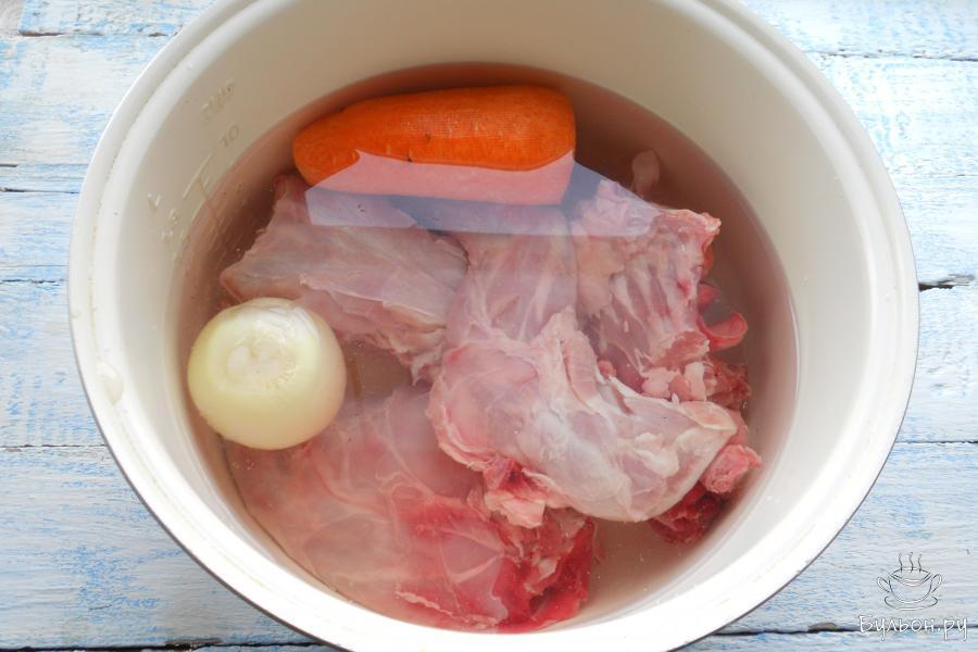 2. Мясо хорошо вымыть, поместить в чашу мультиварки. Влить холодную воду, добавить очищенные лук и морковь. Выставить программу "Холодец" на 3 часа. Через 1,5 часа вынуть морковь и оставить ее для украшения, бульон посолить по вкусу.