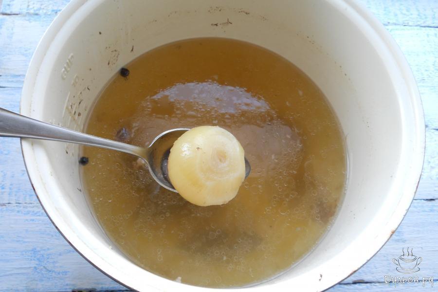 3. Через 3 часа лук вынуть и выбросить. Добавить в бульон перец душистый горошком и лавровый лист. Вновь выставить программу "Холодец" еще на 1 час.