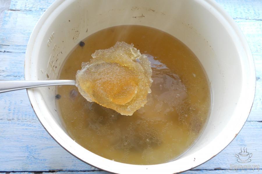 4. Желатин предварительно замочить в холодной воде. Когда время варки выйдет и прозвучит сигнал, мясо вынуть и добавить в бульон желатин и измельченный чеснок. Аккуратно бульон перемешать, желатин должен раствориться. Оставить бульон в чаше мультиварки с открытой крышкой на 30 минут.
