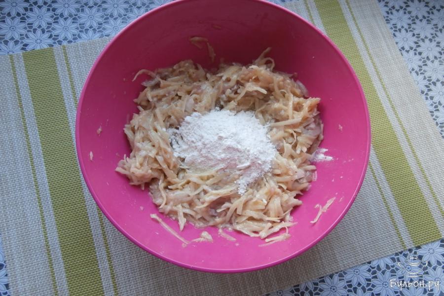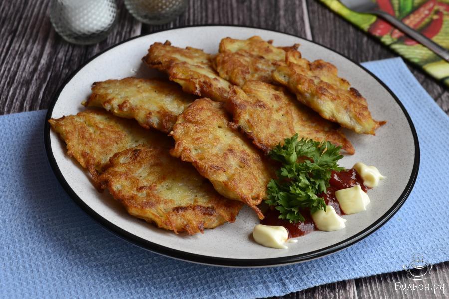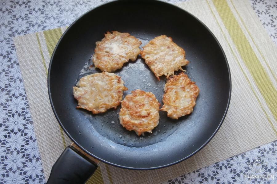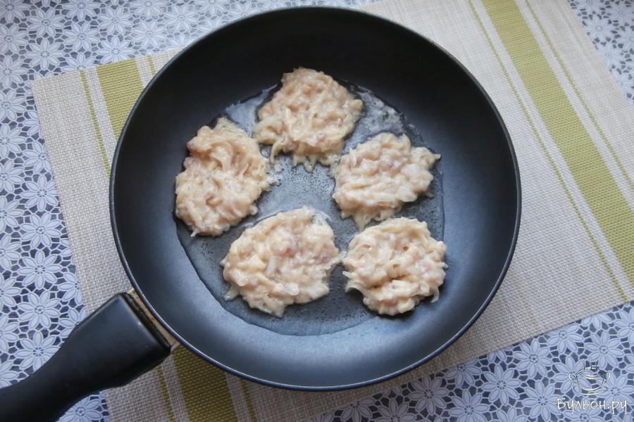 5. Массу выкладывать в разогретую с маслом сковородку ложкой, формируя драники. Жарить на среднем огне до румяности с нижней стороны.