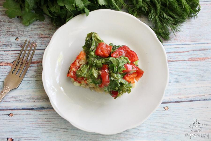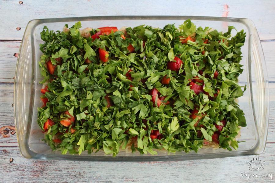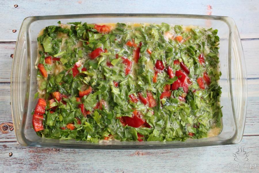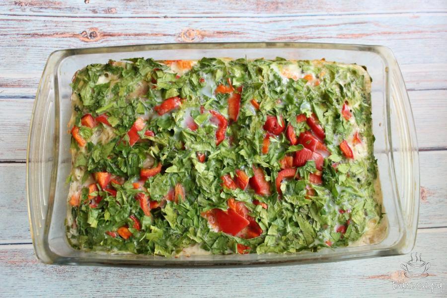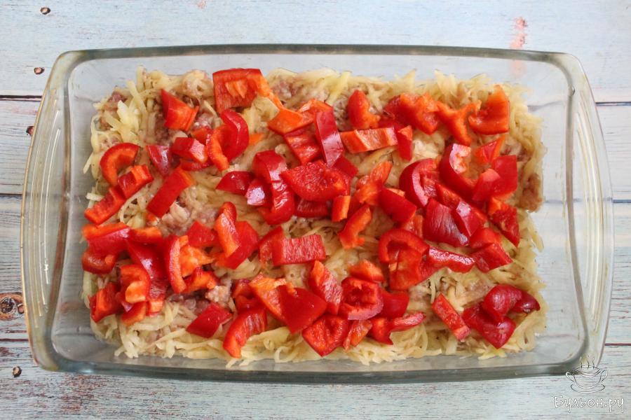7. Красный болгарский перец промоем, уберем семена и нарежем перец мелкими кубиками. Выложим перец поверх картофельной основы.