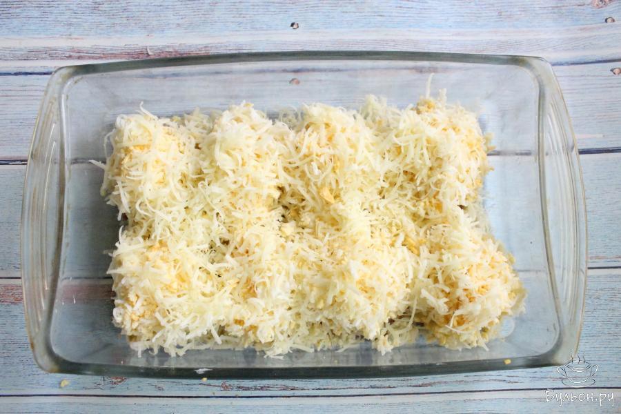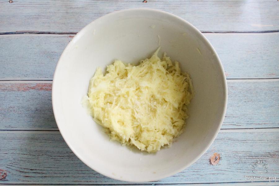 4. Картофель почистить, промыть и натереть через мелкую терку. Немного отжать картофель, посолить и перемешать.