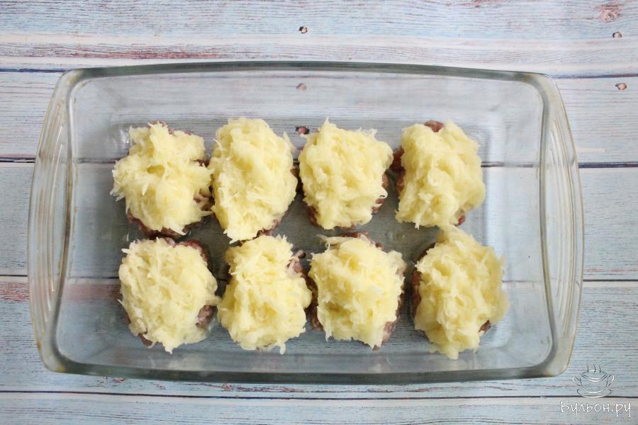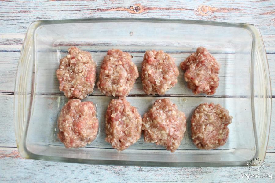 3. Сделать из фарша небольшие плоские лепешечки. Выложить их, близко друг к другу, в форму для запекания.