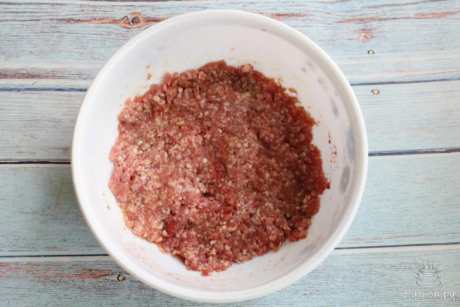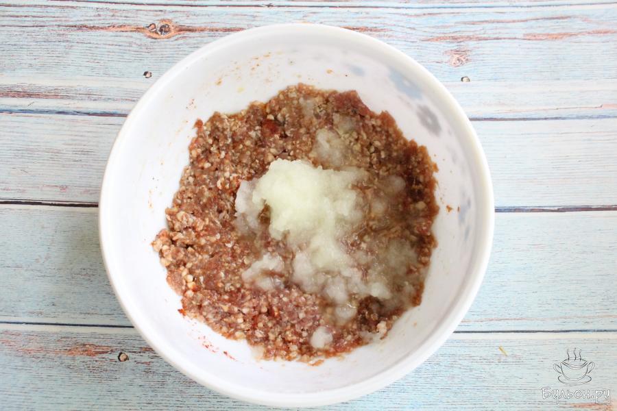 8. На следующий день, добавить к фаршу лук, перетертый через мелкую терку. По желанию, лук можно мелко нарезать. Перемешать фарш.