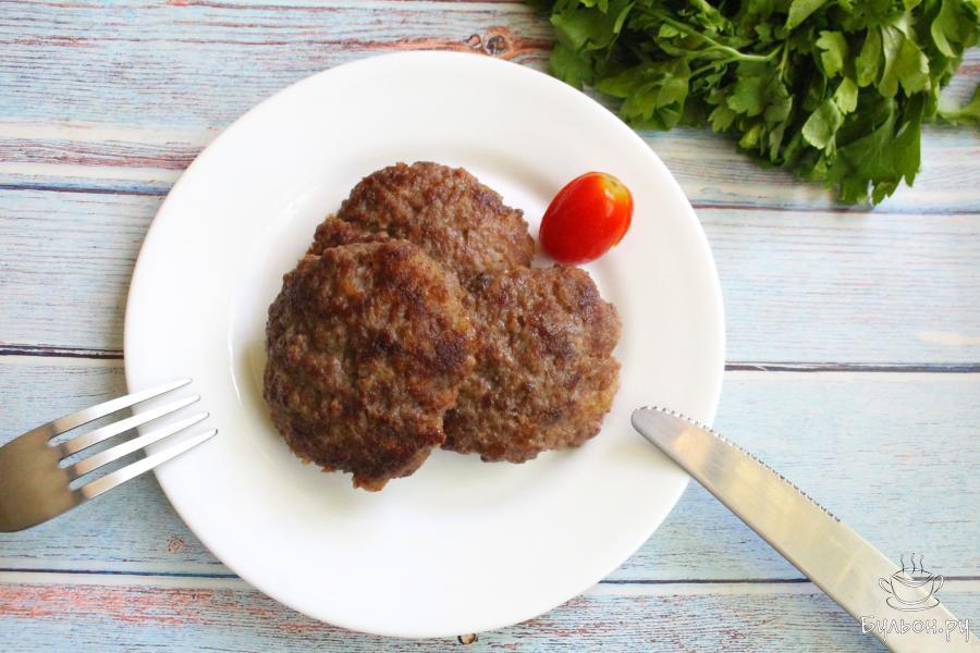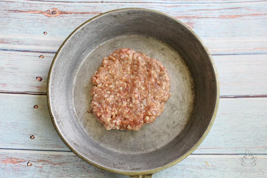 9. Из этого количества фарша можно приготовить одну большую плескавицу, а можно несколько, но небольших - это по желанию. Сформировать из фарша крупные плоские круглые котлеты. Жарить их с двух сторон, по несколько минут с каждой стороны, на сковороде с разогретым растительным маслом.