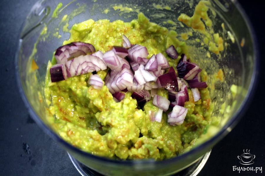 3. Лук очень мелко порезать, добавить к готовой смеси. Перемешать ложкой, так лук останется сладким и не даст горечь. При необходимости, добавить еще соли или сока лайма.