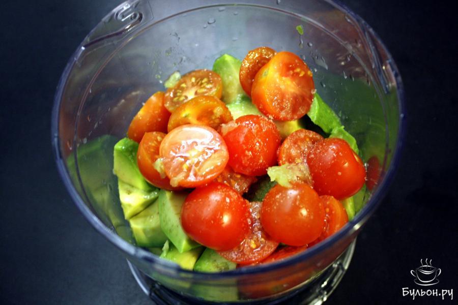 2. С авокадо снять кожицу, вынуть косточку, нарезать небольшими кубиками. Помидоры разрезать пополам. Уложить их в блендер. Посыпать солью и перцем, полить выжатым соком лайма. Измельчить до нужной консистенции. Рекомендуется оставлять небольшие комочки, чтоб лучше чувствовался вкус самого авокадо.