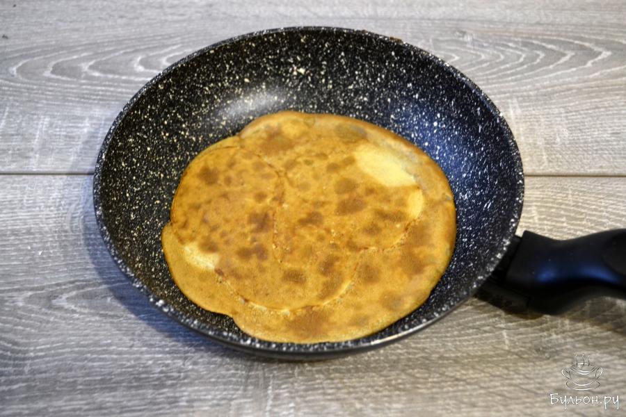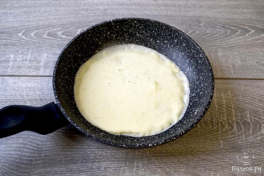 8. Разогрейте сковороду с антипригарным покрытием и вылейте порцию теста. Поворачивая сковороду, распределите тесто по всей поверхности.