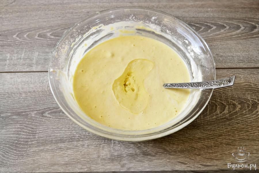 7. Взбейте вилкой массу до получения однородного блинного теста. Возможно, кефира понадобится чуть больше или меньше. Это зависит от сочности кабачка. Влейте растительное масло и еще раз перемешайте. Дайте тесту отдохнуть минут 15-20 на столе.