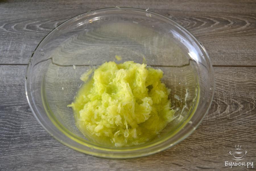 1. Молодой кабачок очистите от кожуры и натрите на мелкой терке в миску. Сок от кабачков не сливайте.