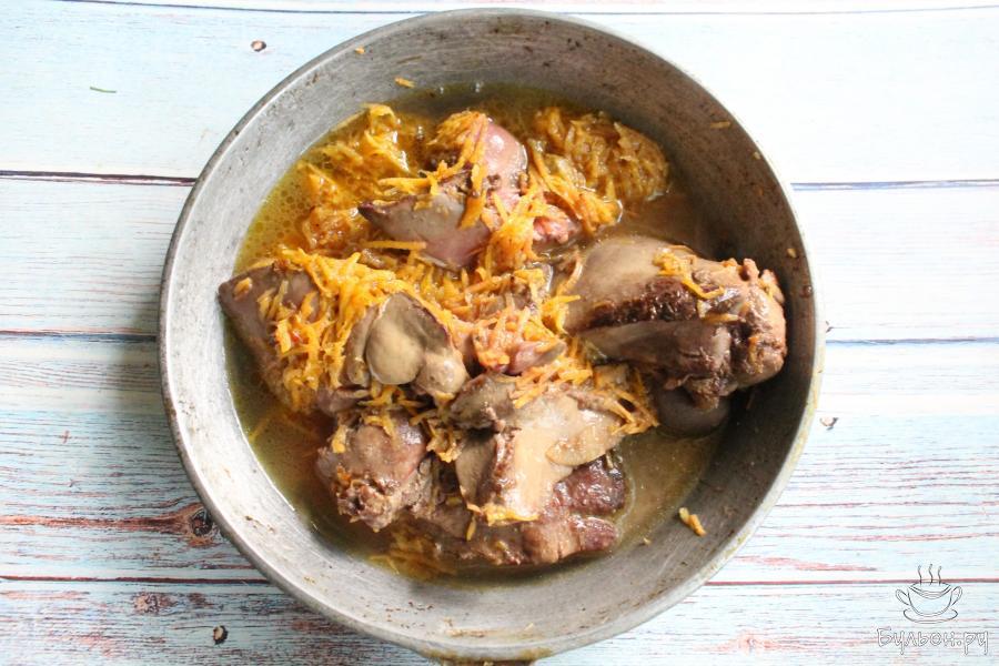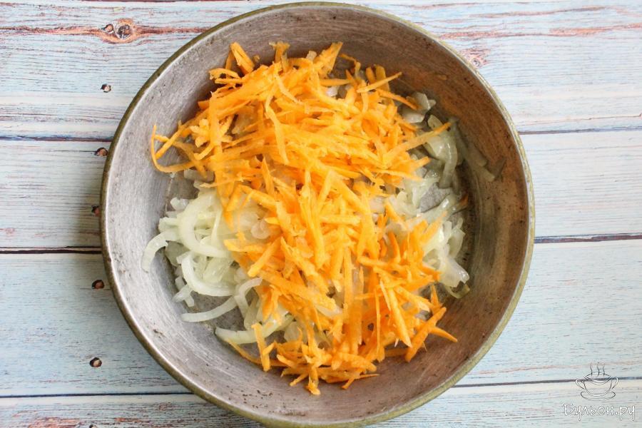 3. Морковь чистим, моем и перетираем через мелкую терку. Добавляем морковь к луку и тушим все вместе 5 минут.