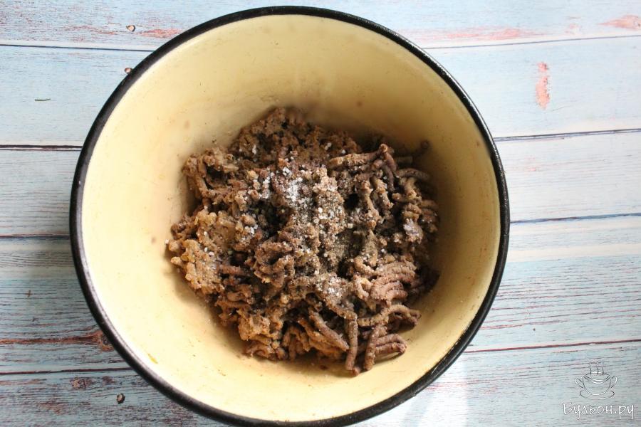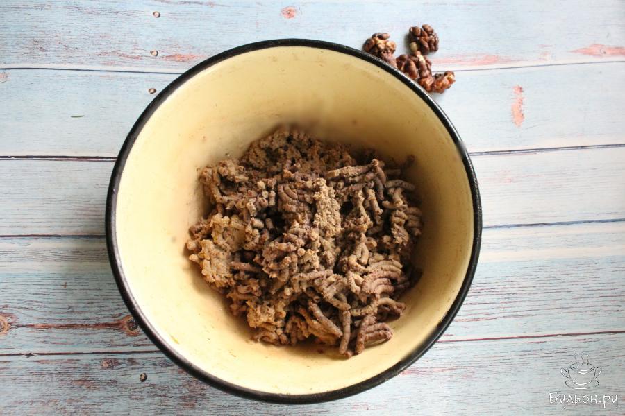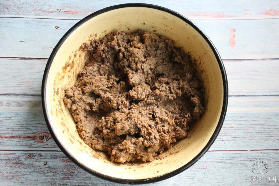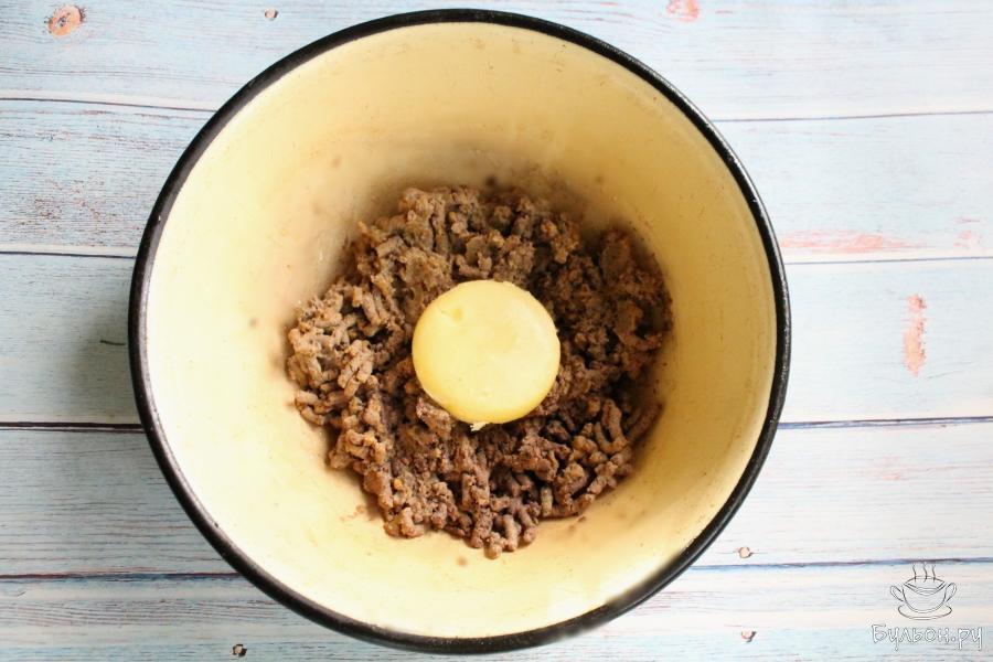 5. Перекручиваем половину печени с овощами через мясорубку с мелкой решеткой. Сразу в горячую массу добавляем сливочное масло.