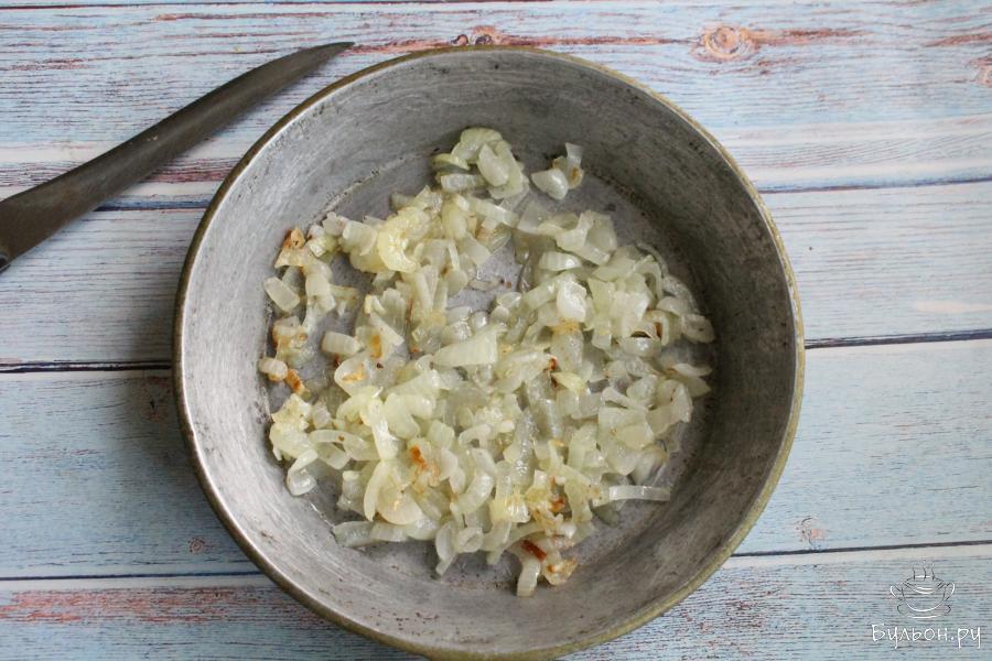 2. Лук чистим, моем. Мелко режем лук и жарим его до мягкости на сковороде с разогретым растительным маслом.