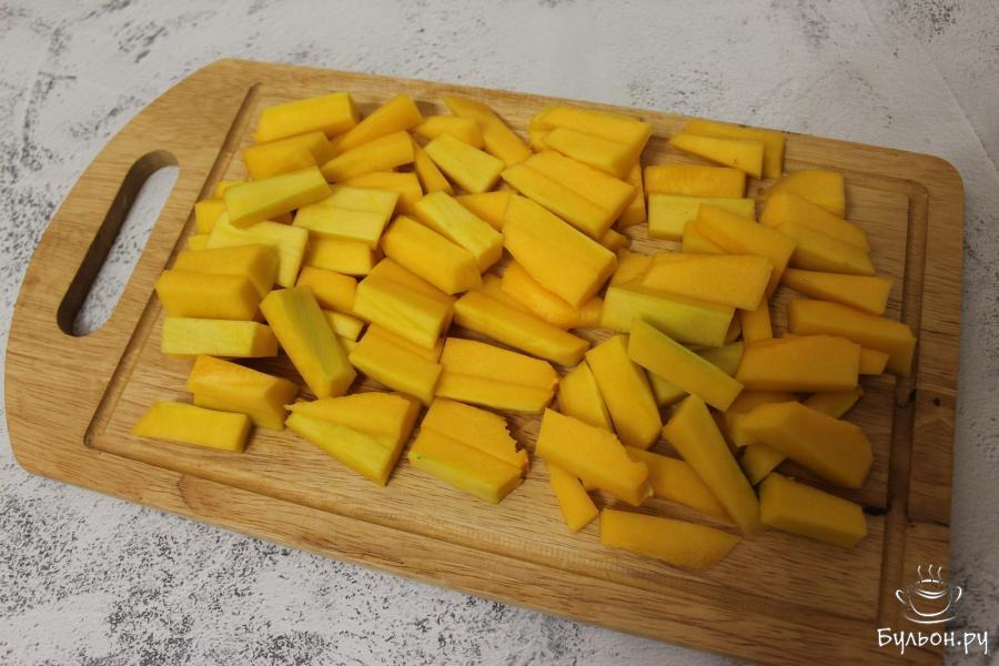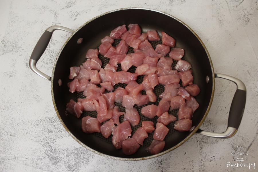 1. Сначала нарезать вымытое мясо на небольшие кубики. Выложить в сковороду, добавить растительное масло и обжарить на среднем огне до румяной корочки.