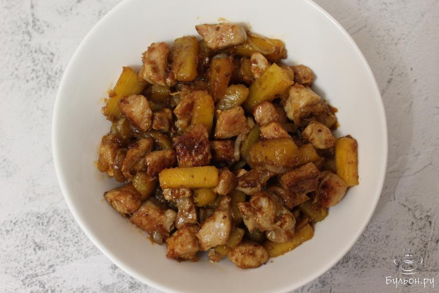6. Жареную свинину с цуккини разложить по тарелкам и подать к столу в горячем виде. Правда, в холодном варианте это блюдо также очень вкусное.