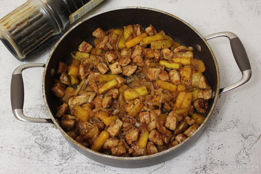 5. После этого влить соевый соус и, помешивая время от времени, готовить свинину с овощами до момента, когда весь соус загустеет.