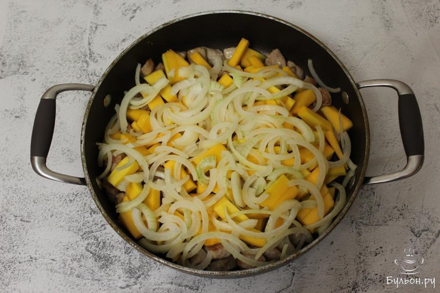4. Когда свинина будет обжарена, добавить подготовленные овощи в сковороду и обжарить в течение примерно 7-8 минут. Овощи должны немного обжариться и стать мягче.