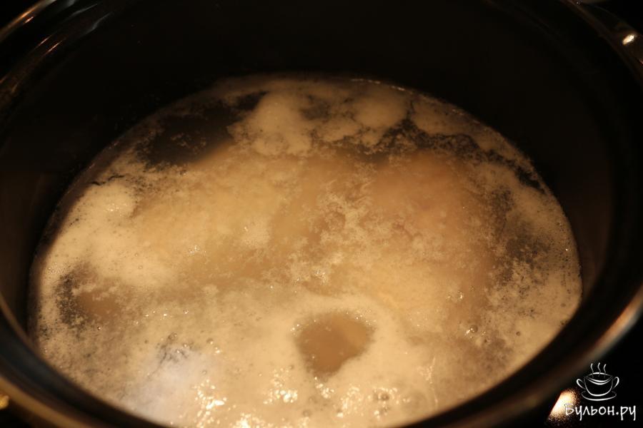 6. Как только закипит бульон, добавить макаронные изделия, соль, универсальную приправу "жаренные овощи". Я использовала макароны в виде буковок. Варить до готовности, минут 5-7.