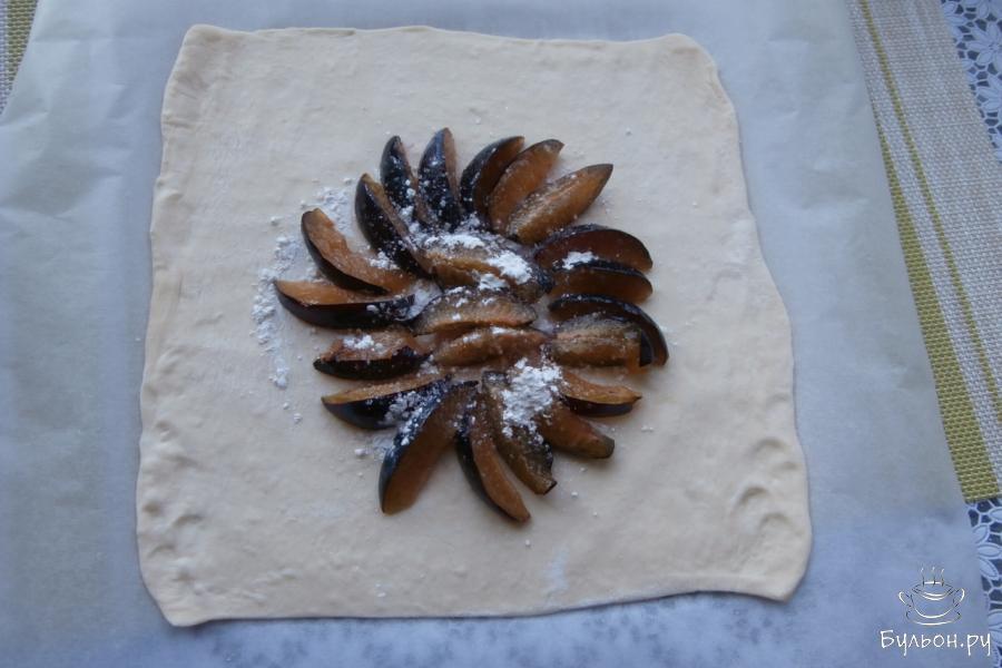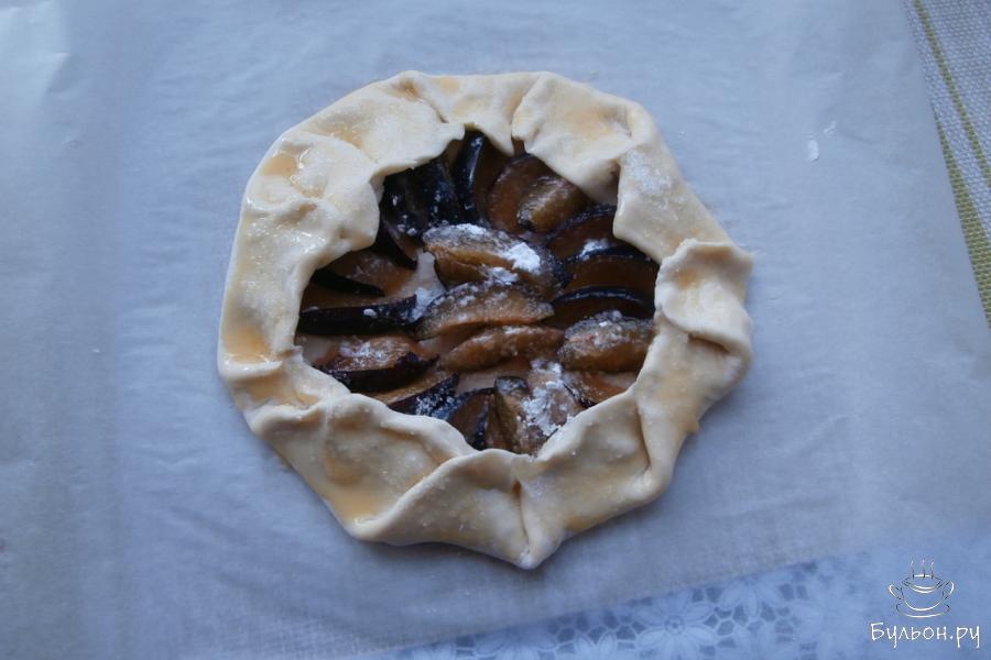 3. Завернуть края теста вовнутрь, оставляя сливы открытыми. Можно вырезать круг для галеты, но я этого не делаю, чтобы не оставались обрезки - тесто тонкое, заворачивается нормально. Смазать завернутые края теста желтком и чуточку присыпать сахаром.