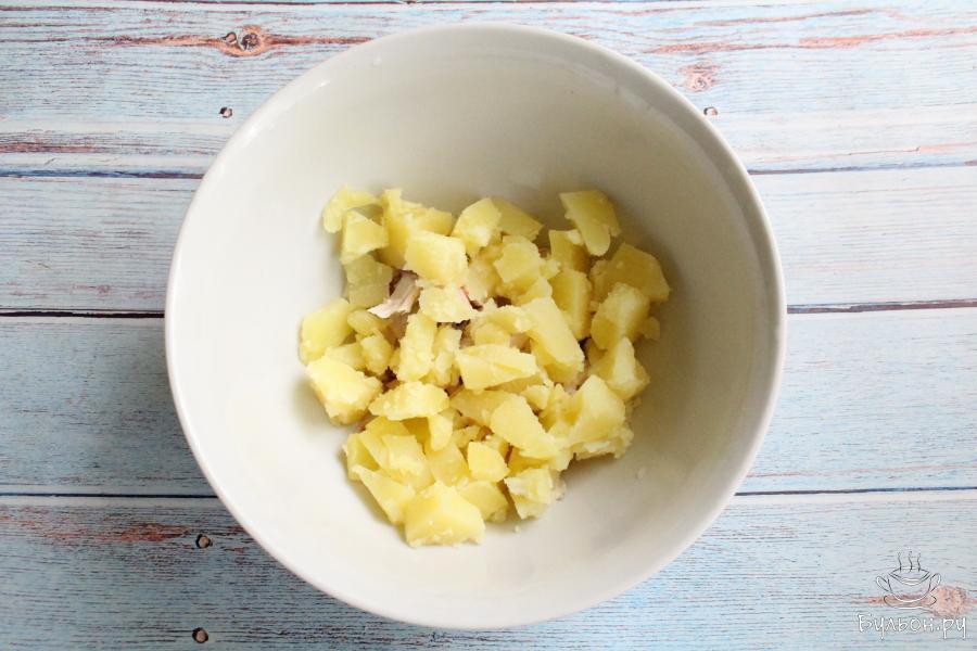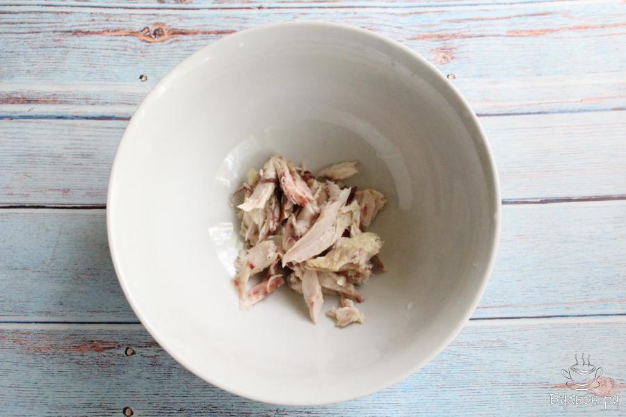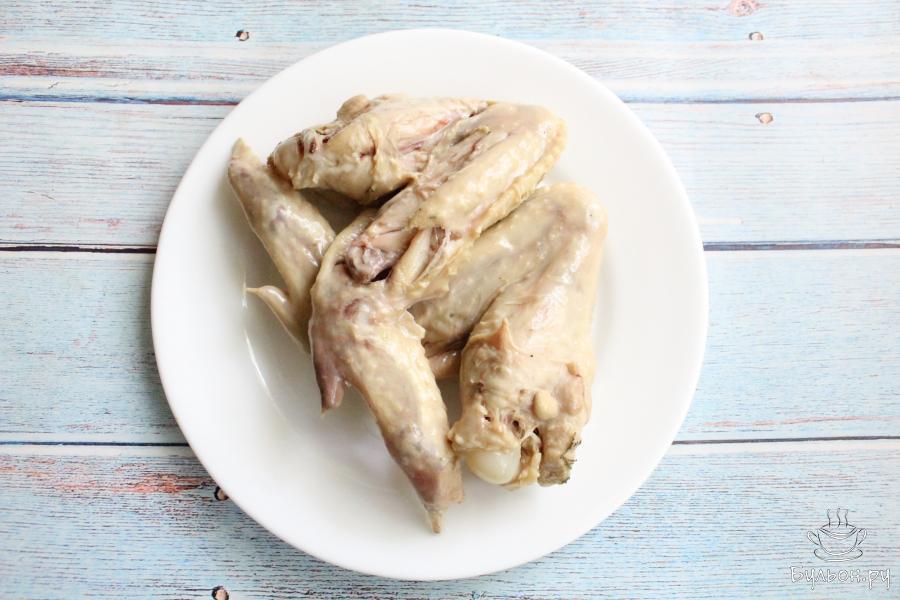 2. Для приготовления салата нам нужен кусочек куриного мяса с любой части куриной тушки. Вполне подойдут вареные куриные крылышки. Снять с вареных крылышек кожицу.