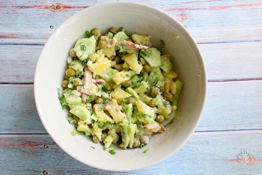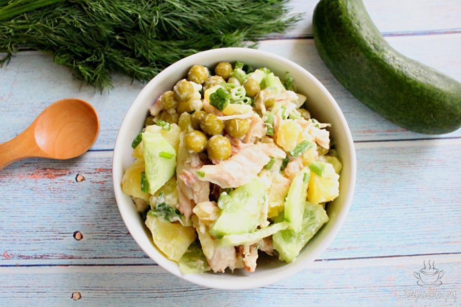 Салат с вареной курицей, зеленым горошком и картофелем получается вкусный, нежный, насыщенный и очень сытный. Порцией такого салата вполне можно заменить обеденное второе блюдо. Салат готовится достаточно быстро, а если у вас под рукой уже заранее есть вареный картофель и вареное куриное мясо, то приготовление займет считанные минуты. Попробуйте приготовить такой салат, он наверняка понравится всей семье.