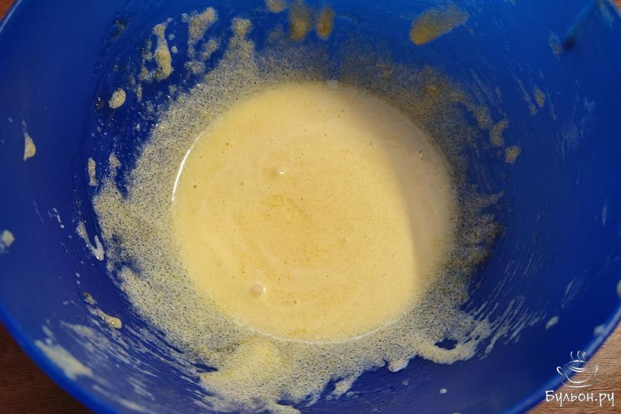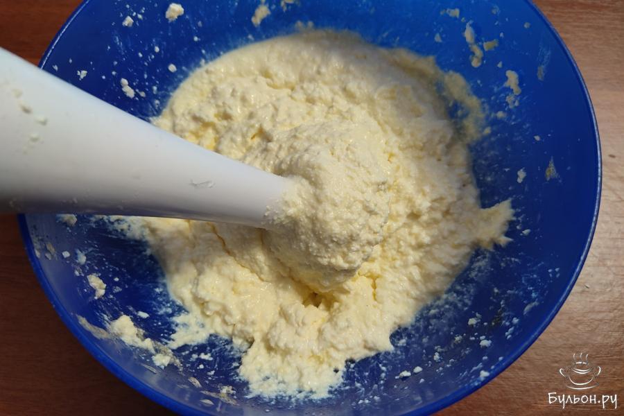 2. Добавить растопленное сливочное масло, манную крупу и творог. Измельчить массу погружным блендером.