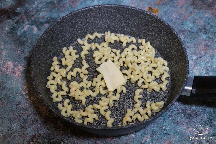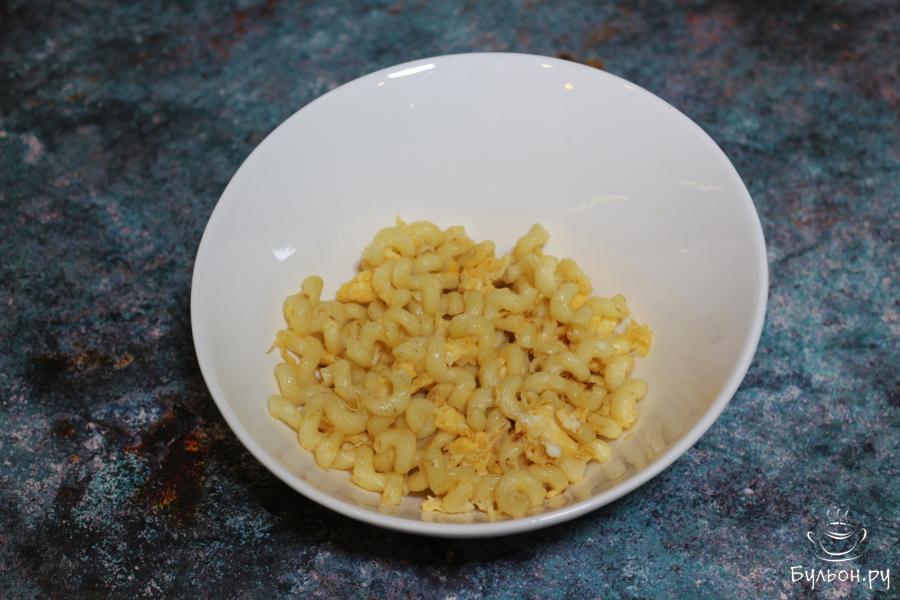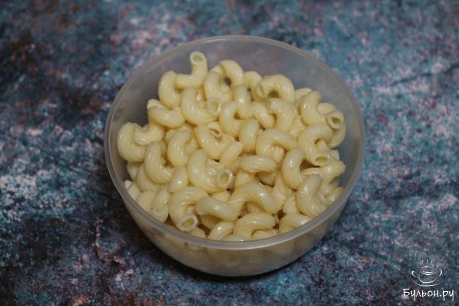2. Отварить макароны в подсоленой воде в соответствии с инструкцией, указанной на упаковке, поскольку время варки зависит от размера макарон и их состава. Готовые макароны промыть под холодной водой и оставить в дуршлаге, чтобы стекла вся вода.