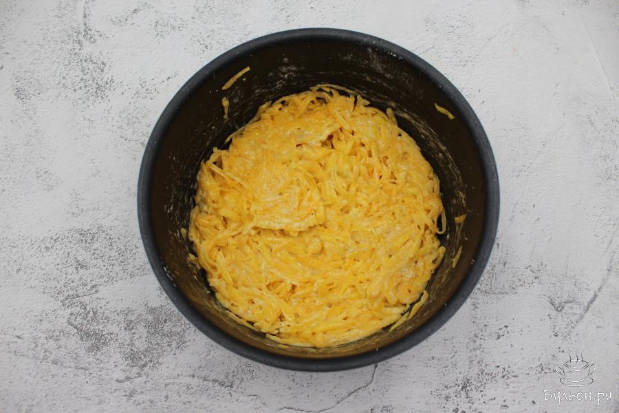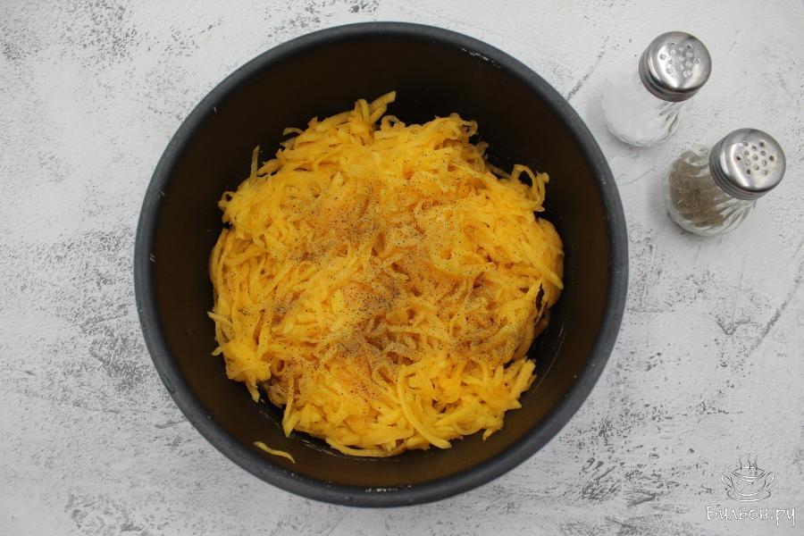2. Отожмите цуккини от лишнего сока, переложите овощную массу в глубокую миску, посолите и поперчите по вкусу.
