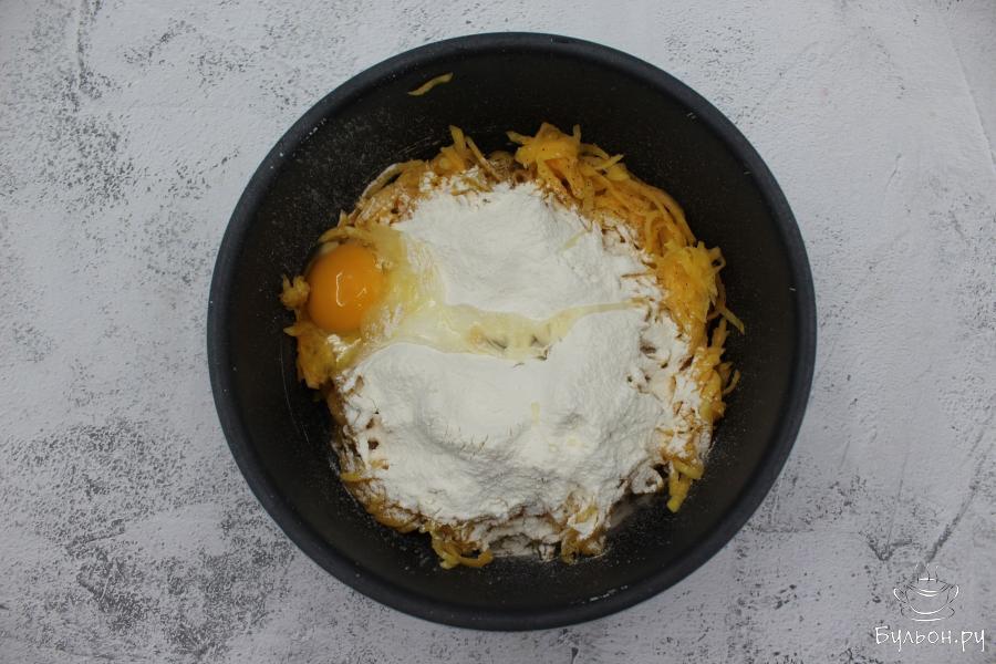 3. Просейте к овощной массе пшеничную муку и вбейте куриное яйцо категории С1. В зависимости от сочности цуккини, вам может понадобится чуть больше муки, чем указано в ингредиентах.