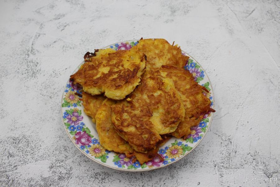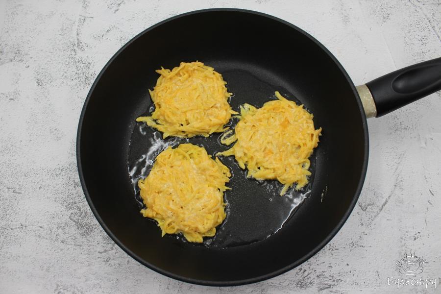 5. На сковороде разогрейте рафинированное масло и на нем, на среднем огне, с двух сторон, обжарьте драники, формируя их при помощи столовой ложки.