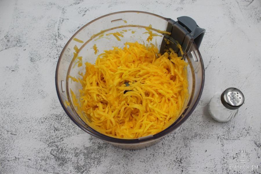 1. Цуккини вымойте, очистите от кожуры, удалите семена и натрите на крупной терке. Добавьте щепотку соли, перемешайте и дайте время, примерно 5-7 минут, чтобы цуккини выделили сок.