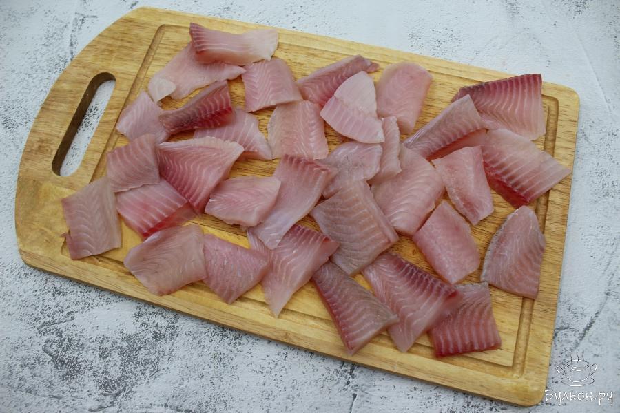 1. Обратите внимание, что вес тилапии указан для филе. Если же вы берете неочищенную рыбу, то учтите этот момент. Первым делом рыбное филе нарежьте на крупные кусочки, удалив все косточки.