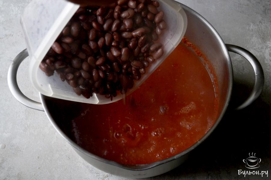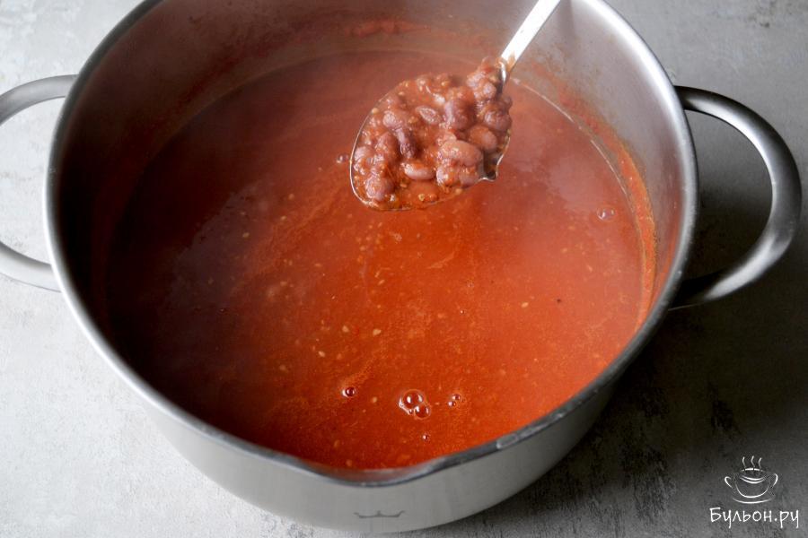 8. Доведите сок с фасолью до кипения, сделайте огонь умеренным и проварите 10-12 минут. В конце варки добавьте уксусную кислоту, перемешайте.