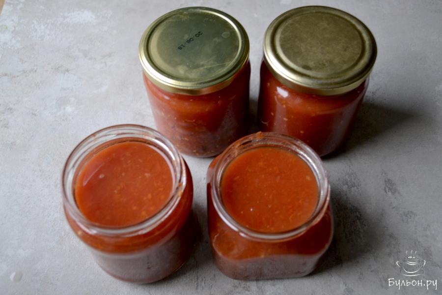 9. Баночки и крышки промойте, банки простерилизуйте в духовке или над паром, крышки прокипятите. Заполните баночки горячей фасолью с томатным соком. Баночки закройте крышками, переверните, проверьте на герметичность. Укутайте баночки под куртку или плед на сутки для постепенного остывания.
