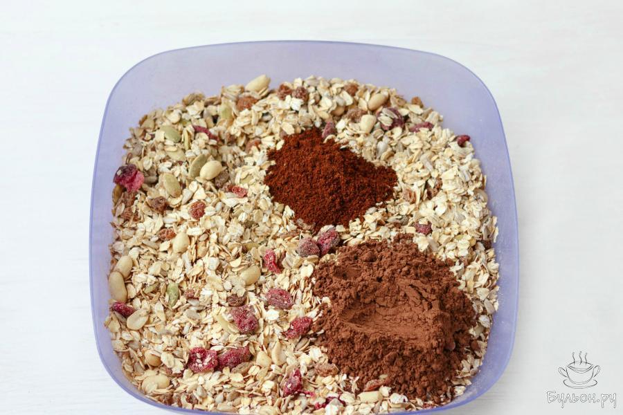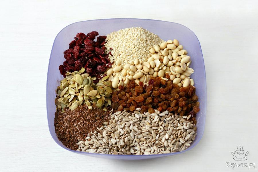 2. Добавьте начинку по вкусу: орехи, семена, сухофрукты. Как правило, на 500 граммов овсяных хлопьев добавляется по 85-165 граммов каждого вида начинки, так чтобы итоговое соотношение начинки и хлопьев получилось 2:1 или 1:1. Крупные орехи и фрукты можно предварительно нарезать небольшими кусочками.
