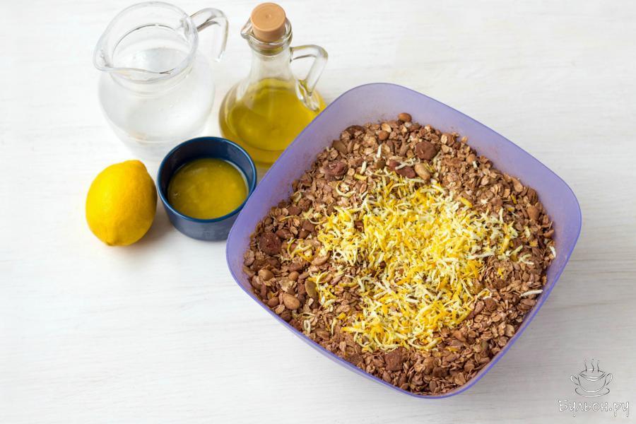 4. Добавьте цедру 1 лимона или апельсина, и тщательно все перемешайте. На этом этапе, для придания граноле сладости, хлопья можно пропитать медовым сиропом.