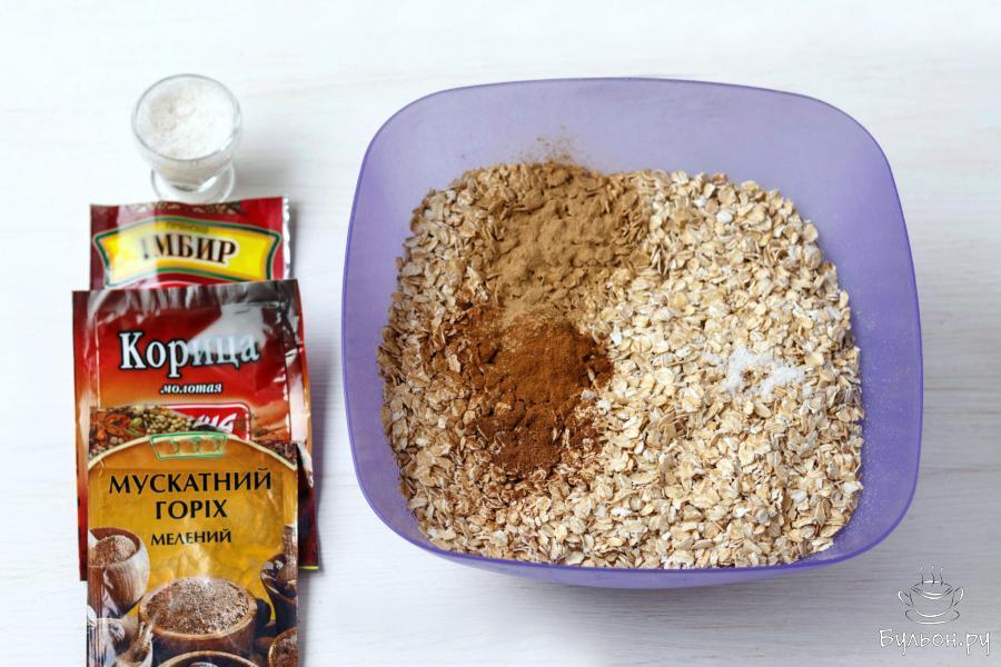 1. В миску отмерьте овсяные хлопья. Добавьте соль, молотую корицу, имбирь и мускатный орех. Тщательно все перемешайте.