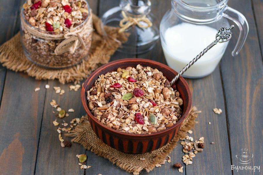 Гранола - готовая смесь для завтрака, состоящая из овсяных хлопьев, сухофруктов, орехов, семян и специй. Полезное и вкусное блюдо, популярное во всем мире Для приготовления блюда, смесь обжариваться или запекается в духовке, с добавлением ароматизаторов, пряностей и сахара. Обжаривание придает смеси хрустящую текстуру, усиливает вкус и раскрывает аромат компонентов. Это универсальное, простое и быстрое в приготовлении блюдо. С составом домашней гранолы можно постоянно экспериментировать, меняя компоненты начинки, снижая или увеличивая количество сахара. Несладкая домашняя гранола - прекрасная основа для приготовления полезного печенья. Гранола с молоком - полезный и быстрый в приготовлении завтрак. Сладкая гранола - отличное дополнение к мороженому, йогурту или украшение десертов. Потратив 15-20 минут на приготовление блюда вы получаете универсальную смесь для выпечки, полезный десерт, завтрак и лакомство в одном флаконе.