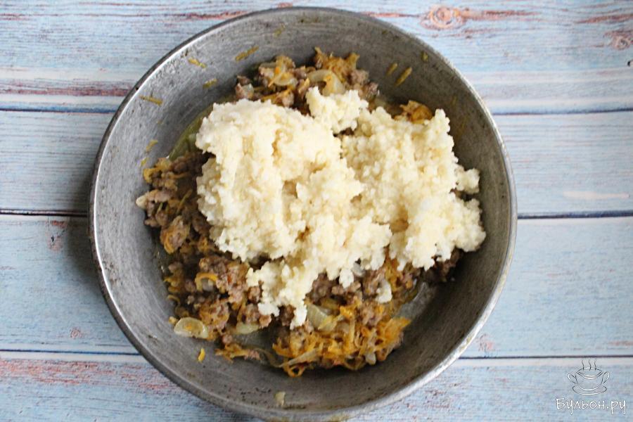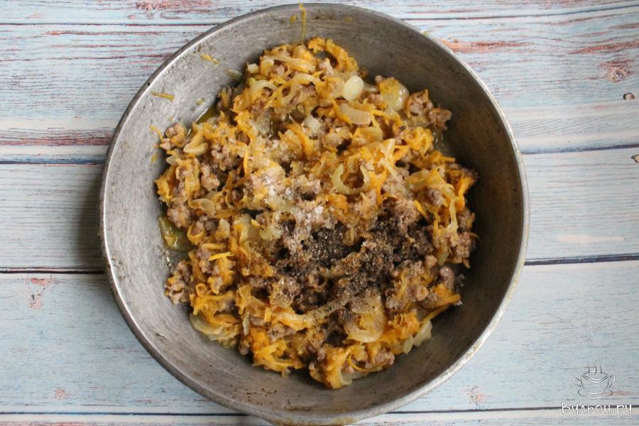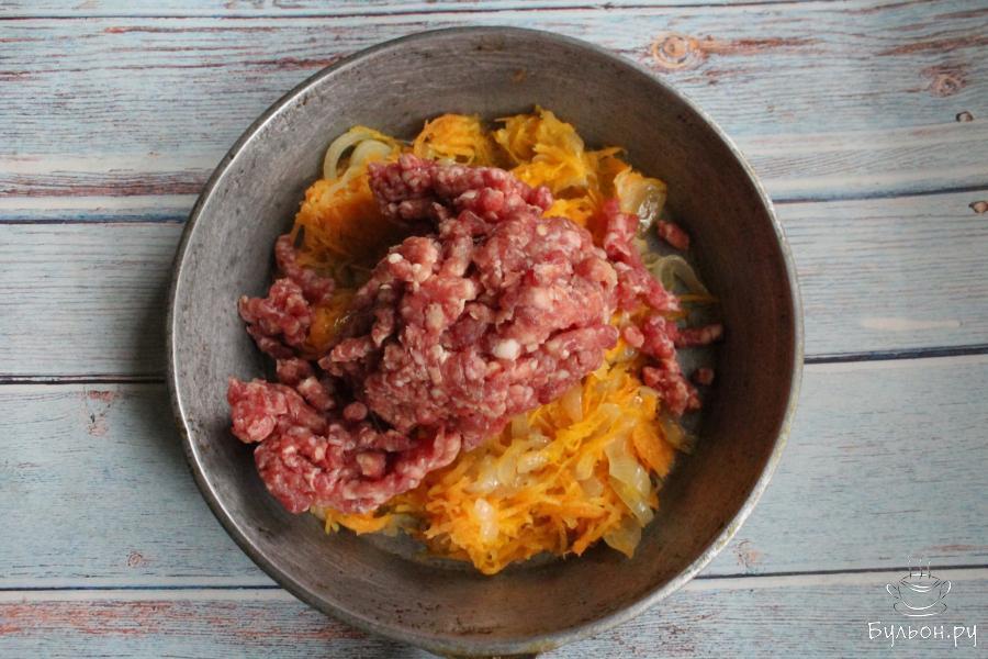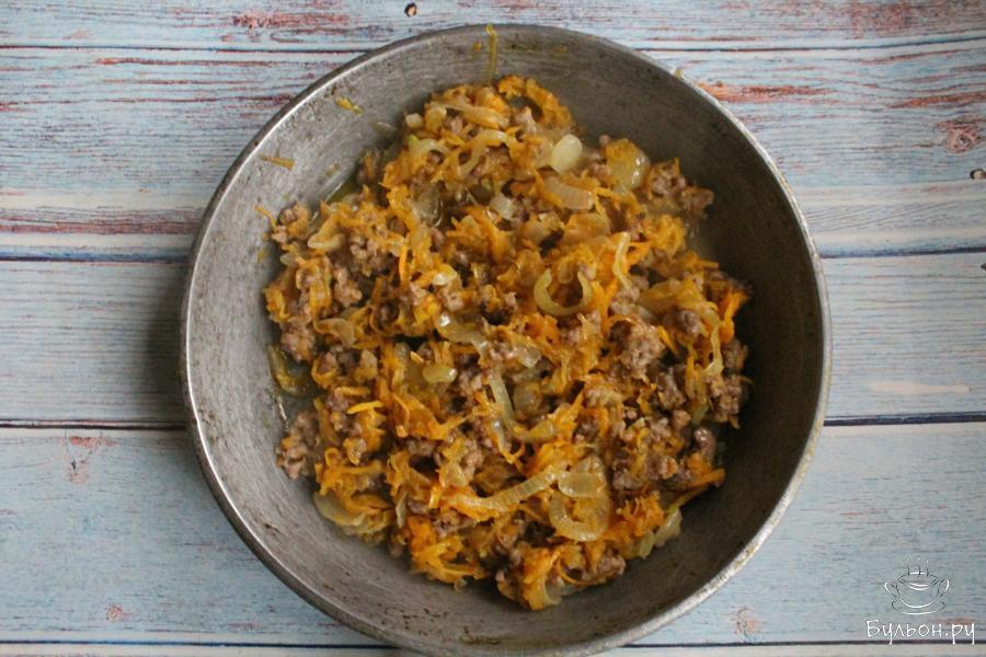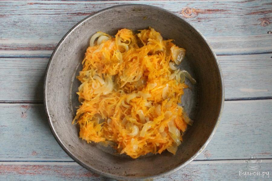 3. Морковь почистить, промыть, перетереть через мелкую терку. Добавить морковь к луку, обжарить все вместе 2-3 минуты.
